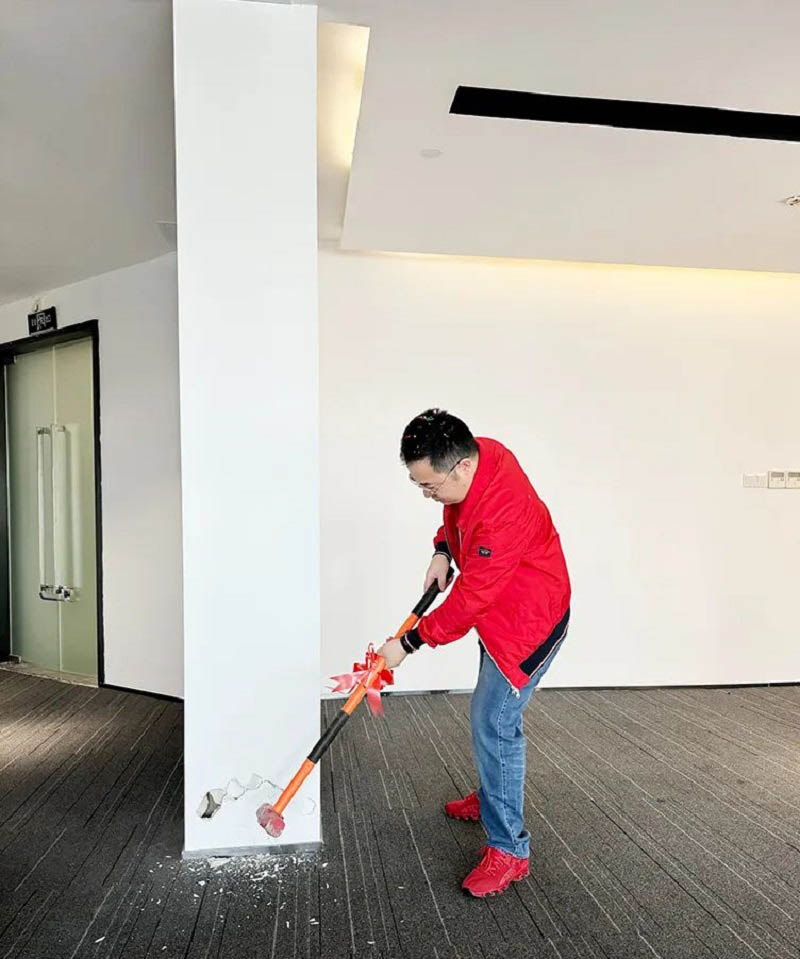 紅桌、紅錘、紅毯,色澤鮮亮紅潤(rùn)的乳豬,紅紅火火!一錘開(kāi)工大吉,二錘財(cái)源廣進(jìn),三錘萬(wàn)事如意!伴隨著禮花的綻放,合景人手握禮錘,一同為新辦公區(qū)裝修開(kāi)工儀式揭開(kāi)序幕。在熱烈的掌聲中,大家共同慶祝辦公樓裝修工程的正式啟動(dòng)!